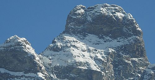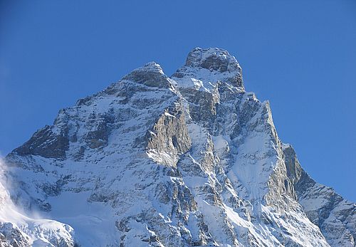 ![]() Das Ziel von Italien im Winter und rechte im Sommer. Links vom Matterhorngipfel der Pic Tyndall (4241 m) der ebenfalls überstiegen werden muss. |