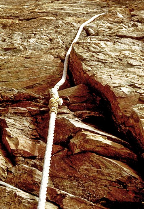 ![]() Kurz vor dem Gipfel einige Fixseile und Leiter aus armdicken Seilen. Die Seilverbindungen waren abenteuerlich und wir entdeckten sie ja erst, als wir dort waren. |