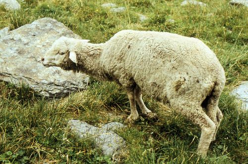 Ein Schaf wurde vom Schäfer an den Vorderläufen gebunden, damit es nicht verschwindet. |