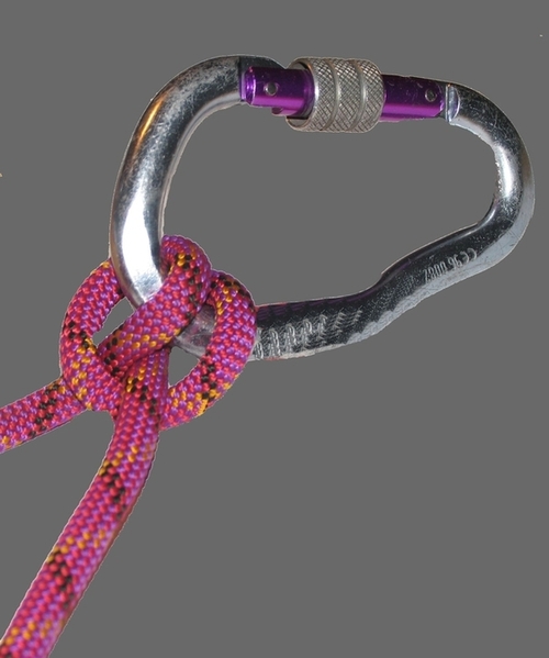 ![]() HMS-Knoten Halbmastwurfsicherungsknoten, also die Hälfte des Knotens rechts. Es ist der Sicherungsknoten im alpinen Bereich. Verwendung nur mit einem HMS-Karabiner, damit durch den größeren Radius der Knoten bei Belastung (Sturz, Reinhängen) auch umspringen kann. Die Hand wird nie vom Bremsseil genommen. Hier ist der Knoten an einem Self-Lock-HMS-Karabiner gemacht. |