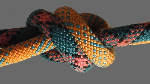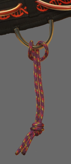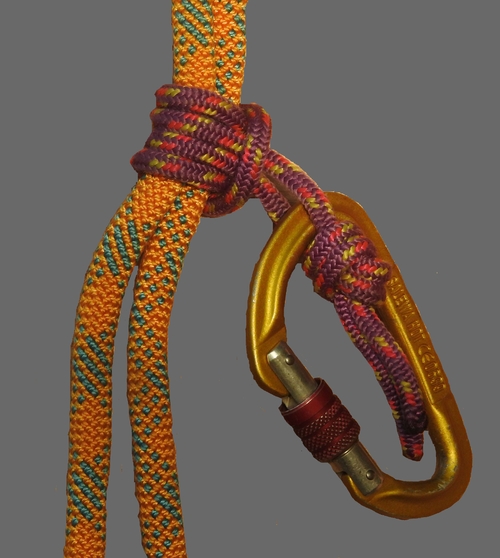 | Prusik-Knoten, ein Klemmknoten Wird als Bremsknoten beim Abseilen verwendet. Für Anfänger und beim Abseilen in unbekanntes Gelände dringend empfohlen Der Knoten wird dabei immer mit der Hand geführt und muss locker sein. Beim Wegnehmen der Hand vom Knoten oder bei Belastung, zieht er sich zu und lässt kein Seil mehr durchlaufen. Das Lösen ist etwas schwierig, weil man den Knoten entlasten muss. Der Karabiner wird in eine Beinschlaufe eingehängt. |