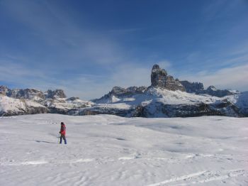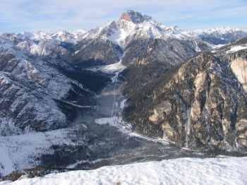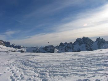 Im Winter sind die meisten Schützengräben, von denen es hier sehr viele gibt, zugeschneit. Dieses Gebiet war im 1. Weltkrieg hart umkämpft. Gerade hier auf dem Monte Piano, wo die österreichischen Kaiserjäger und die italienischen Alpini sich förmlich übereinander lagen, denn hier sprengten die Alpini über lange Stollen die feindlichen Stellungen, die darüber lagen, einfach in die Luft. |