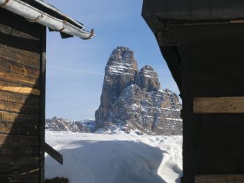 | Nach einem schönen Frühstück (Brühe, Südtiroler Speck, Käse, Roggenbrot und etwas weihnachtliches Gebäck) konnte das Tagesziel angegangen werden: Monte Piana und Monte Piano. Die Drei Zinnen begleiten uns den ganzen Tag und etwas rechts neben der Dreizinnenhütte ist deutlich das 'Frankfurter Würstl' zu erkennen. Leichtester Weg ist eine IV. |